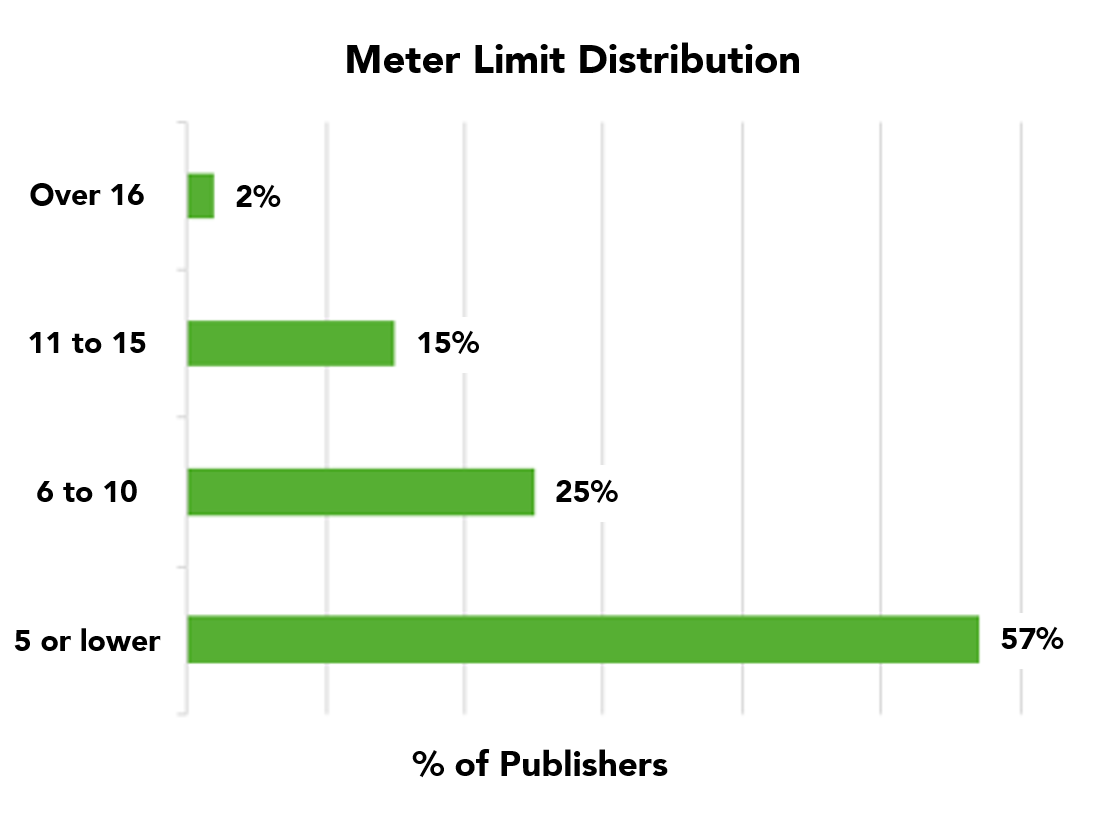 As meters were first introduced, several publishers studied were concerned meter limits might fail to attract subscribers or would constrain advertising revenue; many of these publishers set high meter limits or allowed users to circumvent the paywall. For example, when McClatchy began implementing metered models, it set its meter limits at 25 articles per month and excluded clicks from social media and email newsletters. After seeing a dip in successful conversions, McClatchy increased the types of clicks that counted toward a user’s limit.13 As publishers have experimented, and readers have become accustomed to digital subscription, meter limits have tended to decline among the publishers studied and within the industry at large.14