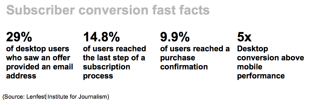 Frictionless purchase: The lower-performing publishers studied often paid little attention to the last step in converting a subscriber: the act of registering for an account and making a purchase. Small changes in the purchase experience for a user – such as slight delays in page load times, unclear instructions, extra data fields, or confusing presentations of an offer – can lead a user to abandon their purchase.