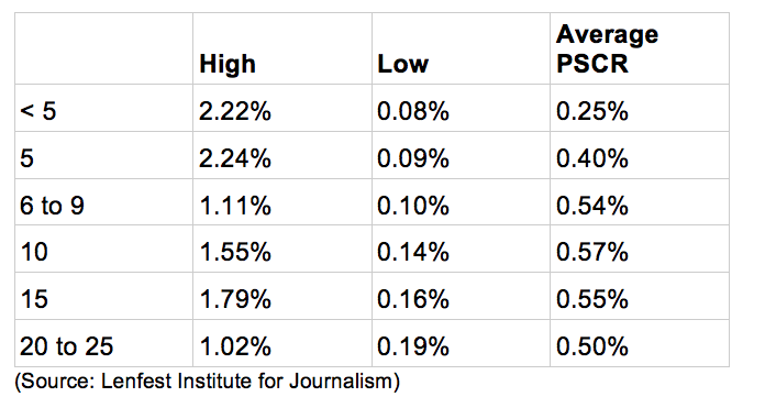 Following the meter stop, the highest-performing publishers studied tended to focus their strategies around their paid stop conversion rate (PSCR), or total users who subscribe in a given month over total users stopped by a meter, wall, or gateway. Across the news organizations in our survey, stop limits and conversion rates tended to be strong predictors of subscription growth. The stop rate multiplied by the PSCR and by the publisher’s unique visitors generates the number of new subscriptions sold in any given month. Conversion emerged as a critical differentiator for sustainable publisher businesses; while the top decile of publishers studied generally converted an average of 1.3 percent of stopped unique visitors per month, the median 50 percent of publishers only converted 0.5 percent of unique visitors.15