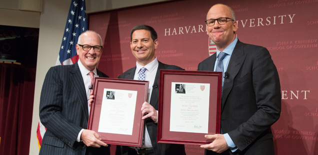 December 1, 2014 – “Optimism for a Change: Media, Campaigns, and 2016.” Theodore H. White Lecture on Press and Politics with Mark Halperin and John Heilemann, managing editors of Bloomberg Politics, and hosts of Bloomberg TV’s “With All Due Respect.” The David Nyhan Prize for Political Journalism was awarded to David Rogers of Politico.